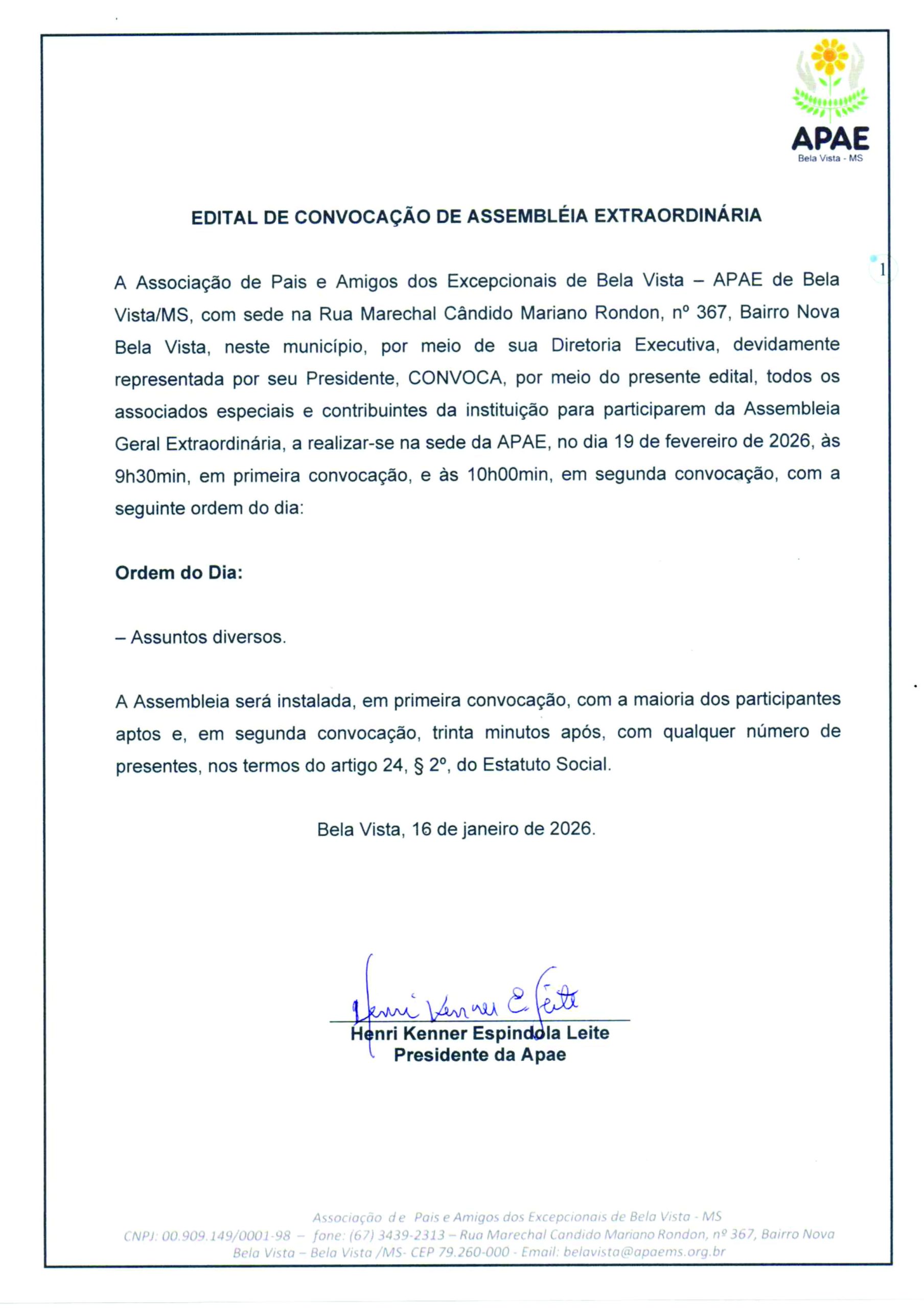 EDITAL DE CONVOCAÇÃO DE ASSEMBLÉIA EXTRAORDINÁRIA – APAE
