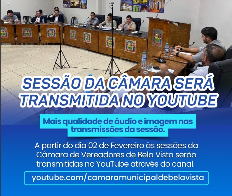 A Câmara Municipal de Vereadores de Bela Vista informa que, a partir do dia 02 de fevereiro, com o retorno das sessões ordinárias, as transmissões passam a ser realizadas pelo YouTube, no canal